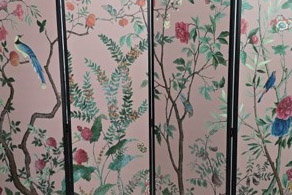 A refined classic looking and elegant folding backdrop featuring oriental floral and bird motifs on a soft pink background, perfect for weddings, photo backdrops, or decorative room dividers.