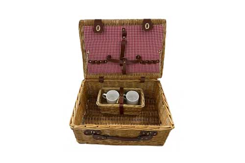 Comes with 2 ceramic mugs , 1 small basket for mugs, 2 plates, 2 forks, 2 knives, 2 spoons, 1 corkscrew opener & 1 set of Gingham picnic mat.