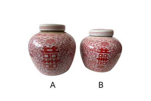 A large red ceramic chinoiserie ginger jar with double happiness motif. *Disclaimer: To be rented per unit and not as set.
