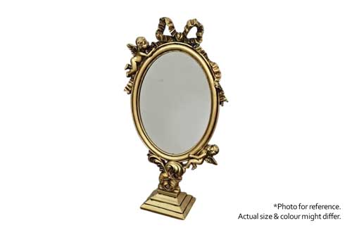 Mirror with ornate gold frame. Suitable for table decoration. Dimensions: 38 cm (h) x 20cm (l). Rental price: RM 22.00/unit. Stock quantity: 1 unit. [booqable_button id="fr097-frame-mirror"]