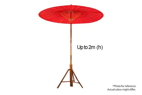 Red oriental bamboo umbrella . Dimensions: Up to 2 meter (h). Rental price: RM 120.00/unit. Stock quantity: 2 units. [booqable_button id="pr061-umbrella-oriental"]