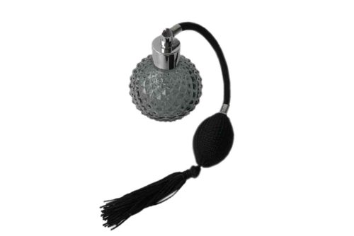 Vintage carved glass empty perfume bottle with atomizer sprayer in black. Available in Silver/Gold cap.