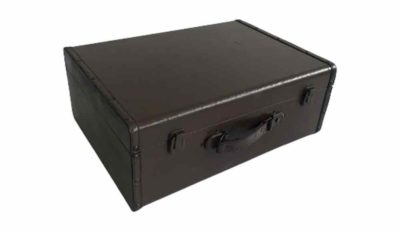 Dark brown vintage-inspired luggage with brown trimmings and handle. Dimensions: 38 cm (l) x 14 cm (w) x 26 cm (h) Rental price: RM 18.00/unit Stock quantity: 1 unit.