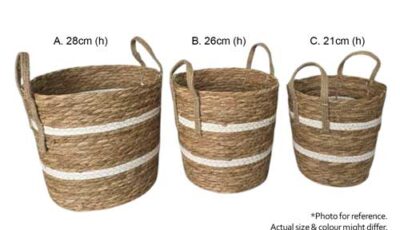 Two striped woven basket with handle. Dimension / Rental Price / Stock Quantity: A. 28cm (h) x 35cm (d) – RM 15.00/unit – 3 units. B. 26cm (h) x 31cm (d) – RM 12.00/unit – […]