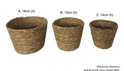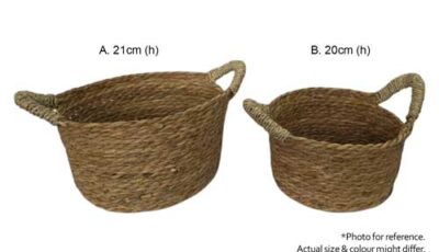 Woven basket in natural jute. Dimension / Rental Price / Stock Quantity: A. 16cm (h) x 21cm (d) – RM 5.00/unit – 6 units. B. 15cm (h) x 18cm (d) – RM 4.00/unit – 4 […]