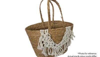 Boho woven basket with handle and macrame. Dimension: 48cm (h) x 43cm (l) x 26cm (w) Rental Price: RM 22.00/unit Stock Quantity: 1 unit.