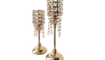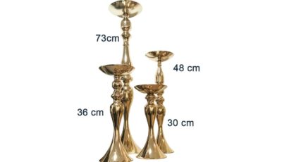 A set of gold crystal candle holder. Can be used as flower holder. To be used with LED candles. Any wax residue will incur in damages fees. Dimensions: 1 unit of 78 cm (h), 1 […]