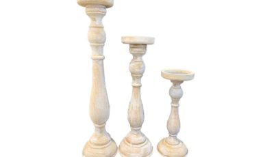 A set of 3 wooden white rustic candle holder. Only to be used with LED candles. Any wax residue will incur in damages fees. Heights: 6 cm (width) x height :13 cm (S), 17 cm […]