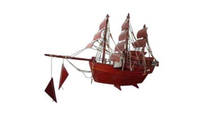A wooden ship nice for display. Dimensions: 57cm (l) x 13cm (w) x 43 cm (h). Rental price: RM 25/unit. Stock quantity: 1 unit.