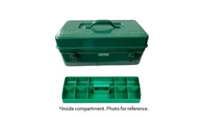 Green colour fishing tackle box. Suitable for fishing theme party. Dimensions: 41.5cm (l) x 21cm (d) x 18cm (h) Rental price: RM 20/unit. Stock quantity: 1 unit.
