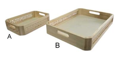 Rectangle wooden tray with holder in light wooden colour. Dimensions / Rental price / Stock quantity: A. 6cm (h) × 24cm (l) × 18cm (w) – RM 4.00/unit – 4 units. B. 6cm (h) × […]