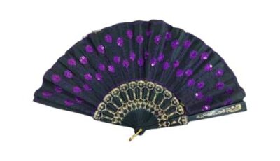 Black and purple sequin foldable lace fan. Suitable for Victorian, Gatsby, Lolita and Vintage themes. Dimensions: 22cm x 43cm Rental price: RM 4/unit Stock quantity: 1 unit.