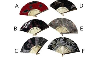Assorted design of batik motif foldable fan. Suitable for Hari Raya or Malay traditional themes. Dimensions: Standard fan size. Rental price: RM 3/unit. Stock quantity: 1 unit each.