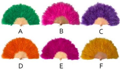 Assorted colors of feathers foldable fan. Suitable for Victorian, Gatsby, Mardi Gras, Lolita and Vintage themes. Dimensions: H – 30cm, L – 50cm. Rental price: RM 8/unit. Stock quantity: 2 units each.