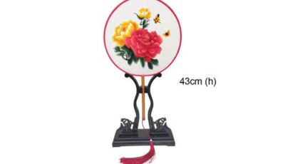 A traditional round embroidered Chinese Fabric Hand Fan with Wooden Handle Tassel Decoration with Fan Stand. Dimensions: H – 30cm, L – 50cm. Rental price: RM 20/unit. Stock quantity: 2 units each.