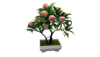 Artificial Peach Bonsai Tree. Height: Approximately 23cm (h) x 10 cm (w) Rental price: RM 5.00/unit. Stock quantity: 2 units.