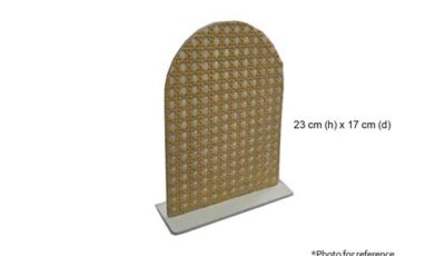 Double sided white stand with rattan background. Dimensions: 23 cm (h) x 17 cm (d) Rental price: RM 5.00/unit Stock quantity: 3 units.