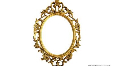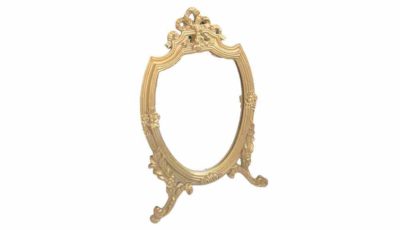 Vintage gold ornate mirror frame with leg stand. Dimensions: 20cm (w) x 33cm (h) Rental price: RM 10.00/unit. Stock quantity: 1 unit.