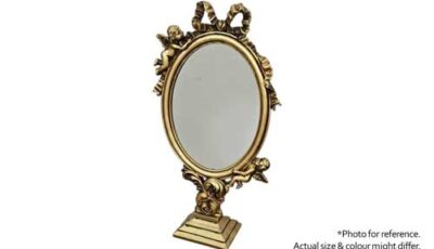 Small size standing mirror with bronze & gold frame. Dimensions: 21 cm (l) x 27 cm (h) x 1.5cm (w). Rental price: RM 5.00/unit. Stock quantity: Bronze – 1 units, Gold – 1 unit.