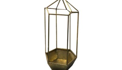 A large antique gold geometric centrepiece holder. Only to be used with LED candles. Any wax residue will incur in damages fees. Dimensions: 58cm(h) × 30cm(d). Rental price: RM 28.00/unit Stock quantity: 2 units