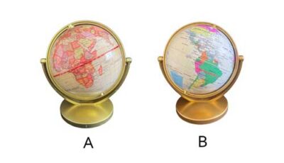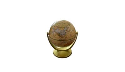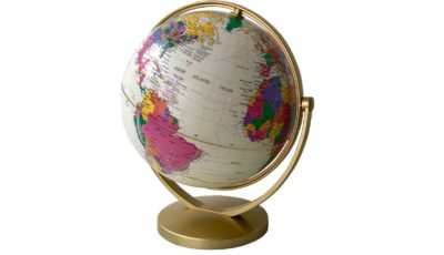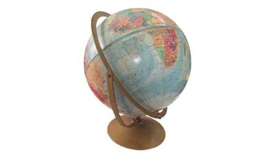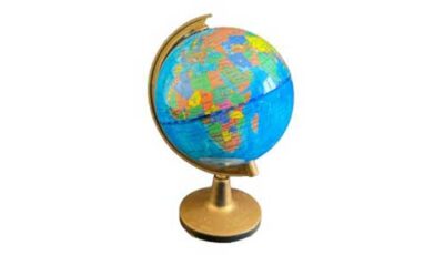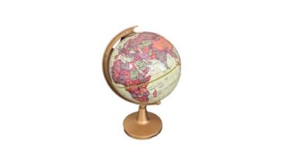 A small multicolour globe with gold framing. Dimensions: 16.5 cm (h) x 12 cm (d). Rental price: RM 6.00/unit. Stock quantity: 6 units.