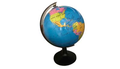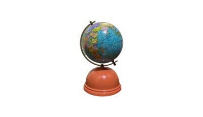 A multicolour globe with peach colour stand base. Dimensions: 20 cm (h) x 14 cm (d). Rental price: RM 13.00/unit. Stock quantity: 1 unit.