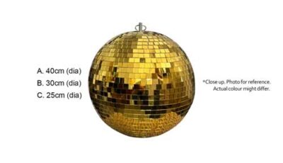 A gold colour disco ball in 3 different sizes for props. *Disclaimer: Photo shown is for reference only. Dimensions / Rental price: A. 40cm – RM45/unit, B. 30cm – RM35/unit, C. 25cm – RM25/unit. Stock […]