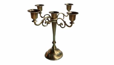 Bronze 5 arms candelabra. Only to be used with LED candles. Any wax residue will incur in damages fees. Dimensions: 26 x 27 cm (approximately) Rental price: RM 12.00/unit Stock quantity: 2 units