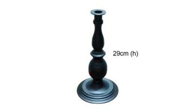 A black candle holder. Only to be used with LED candles. Any wax residue will incur in damages fees. Dimensions: 14 cm (d) x 29 cm (h). Rental price: RM 7.00/unit. Stock quantity: 7 units.