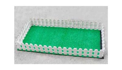 Mini barnyard faux grass tiles with fence. Dimensions: 100cm (w) x 50 cm (d) x 13 cm (h) Rental price: RM 25.00/unit Stock quantity: 1 unit.
