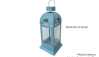 Blue colored lantern with glass. Only to be used with LED candles. Any wax residue will incur in damages fees. Dimensions: 21 (d) x 49 cm (h). Rental price: RM 20.00/unit Stock quantity: 1 unit.
