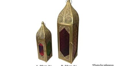 Cylinder shape gold Moroccan lantern. Have existing fairy lights (*Battery not provided. 3 units of AAA battery needed for each lantern if want to light up). Any wax residue will incur in damages fees. Dimensions […]