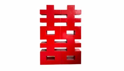 Red Wooden Double Happiness character. Suitable for Chinese wedding. Dimensions: 120 cm (h) x 80 cm (l) Rental price: RM 120.00/unit Stock quantity: 1 unit