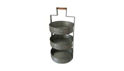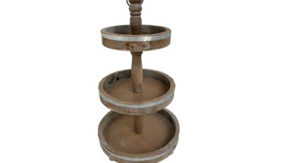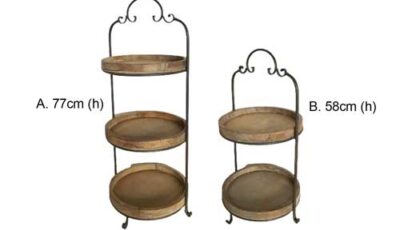 3 tiered rustic vintage dessert stand Overall dimensions: 60 cm (total heights), Tray diameter: 24 cm, 30 cm and 36 cm. Rental price: RM 28.00/unit Stock Quantity: 4 units.