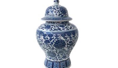 Large ceramic chinoiserie ginger jar with blue and white floral motif. Can be used as display or vase. Suitable for chinoiserie , floral, old shanghai, Chinese and vintage themes. Dimensions: 22 cm (d) x 37 […]