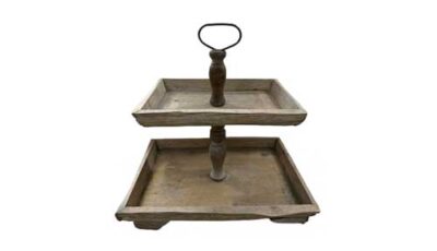 2 tiered wooden rustic dessert stand Overall dimensions: 36 cm (d) x 43 cm (h) Rental price: RM 28.00/unit Stock Quantity: 1 unit