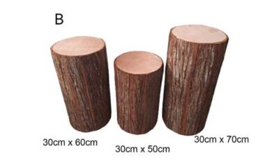 Tree Stump Pedestals. Comes in 3 pieces. Rented as a set of 3. Dimensions / Stock quantity / Rental price: A. 30cm (d) x 60cm (h), 2 units of 30cm (d) x 70cm (h) – […]