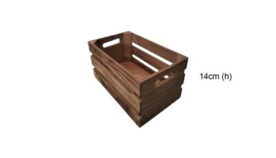 Timber crate for your rustic themed party. Dimensions: 26cm (l) x 16cm (w) x 14cm (h). Rental price: RM 8.00/unit. Stock quantity: 1 unit.