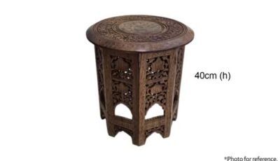 Wooden Moroccan style pedestal stands or stools. Foldable base. Dimensions: 30cm (h) x 30cm (d). Rental price: RM 30/unit. Stock quantity: 1 unit.