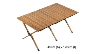 Foldable picnic / camping table. Suitable to be paired up with KRC02. Dimensions: 45cm(h) × 120cm(l) × 60cm(w), Rental price: RM 22.00/unit. Stock quantity: 12 units.