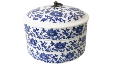 3-level ceramic tiffin in blue and white. Dimensions: 15 cm (d) x 20.5 cm (h) Rental price: RM 20.00/unit Stock quantity: 1 unit