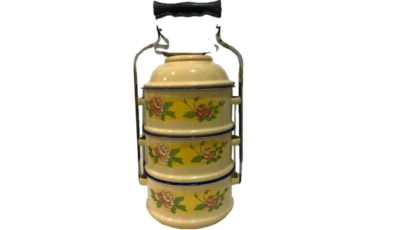 3-level metal vintage Peranakan yellow floral tiffin. Dimensions: 14.5 cm x 35 cm (h) Rental price: RM 15.00/unit Stock quantity: 1 unit