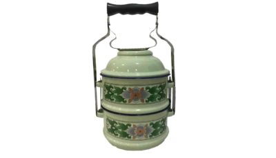 2-level metal vintage Peranakan light green floral tiffin. Dimensions: 14.5 cm (d) x 29 cm (h) Rental price: RM 12.00/unit Stock quantity: 1 unit
