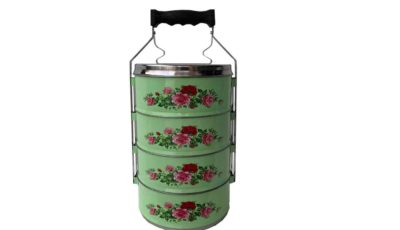 4-level metal vintage Peranakan light green floral tiffin. Dimensions: 18 cm (d) x 37 cm (total height) Rental price: RM 15.00/unit Stock quantity: 1 unit