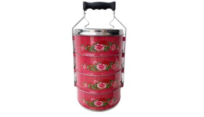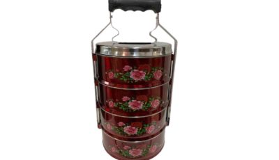 4-level metal vintage Peranakan red floral tiffin Dimensions: 18 cm (d) x 37 cm (total height) Rental price: RM 15.00/unit Stock quantity: 1 unit
