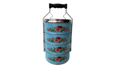 4-level metal vintage Peranakan pastel blue floral tiffin. Dimensions: 18 cm (d) x 37 cm (total height) Rental price: RM 15.00/unit Stock quantity: 1 unit