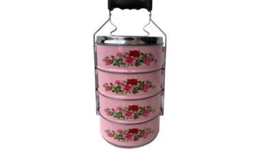 4-level metal vintage Peranakan rose pink floral tiffin. Dimensions: 18 cm (d) x 37 cm (total height) Rental price: RM 15.00/unit Stock quantity: 1 unit