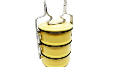 3-level metal vintage yellow tiffin. Dimensions: 13cm (d) x 25cm (h) Rental price: RM 6.00/unit Stock quantity: 1 unit