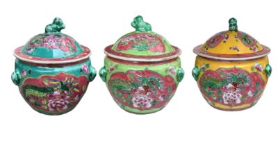 Beautiful Antique Peranakan Nyonya Kam Cheng Porcelain pot with Phoenix and Peonies motifs in assorted colors. Dimensions: 15cm (d) x 16cm (h) Rental price: RM 70.00 /unit Stock quantity: 6 units