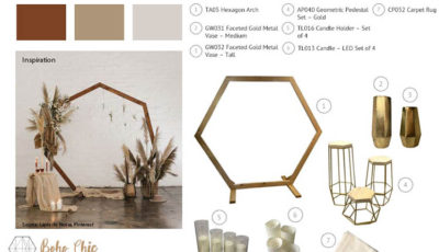 Boho Chic Package A includes: TA05 Hexagon Arch GW031 Faceted Gold Metal Vase – Medium GW032 Faceted Gold Metal Vase – tall AP040 Geometric Pedestal Set – Gold TL016 Candle Holder – Set of 4 […]